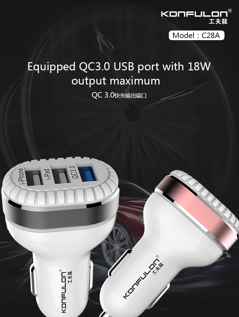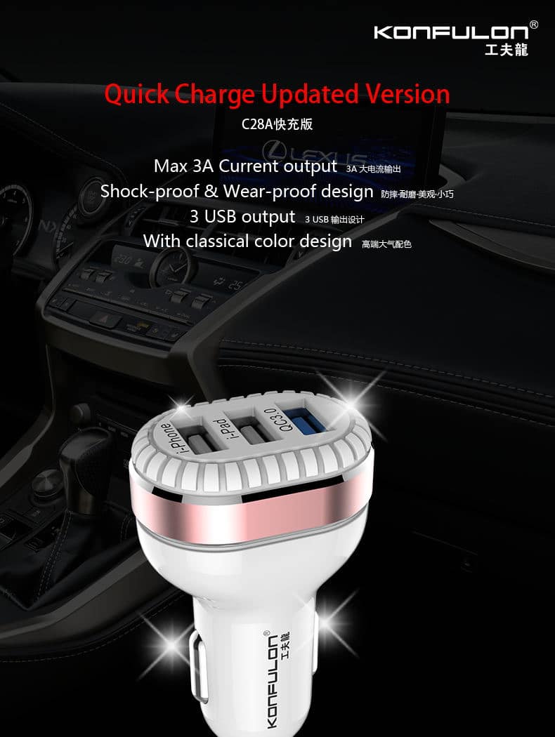 امروزه با افزایش استفاده از تلفن همراه و همچنین اینکه بخش عمده ای از زمان خود را در خودرو می گذرانیم و نیاز به شارژ کردن باتری بیشتر نمایان می شود ، استفاده از شارژرهای فندکی خودرو راه حل مناسبی می باشد. ساخت مدل های مختلف این گجت های مفید و کاربردی کاربران را در انتخاب محصول مناسب را با سختی روبه رو می نماید . شارژر فندکی KONFULON با دارابودن سه خروجی USB می توان سه دستگاه را بطور همزمان شارژ کند .